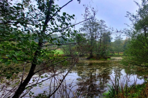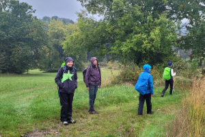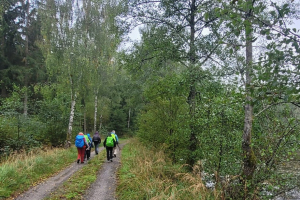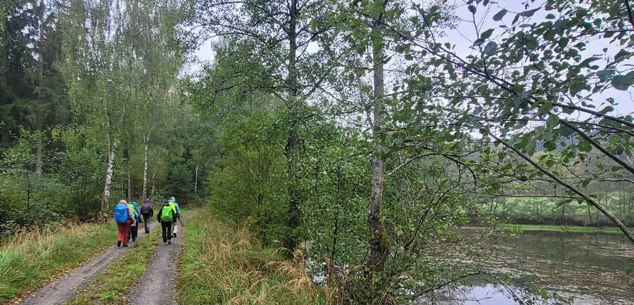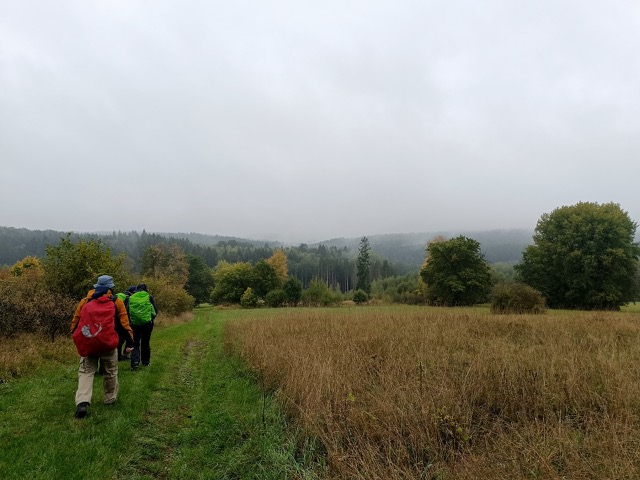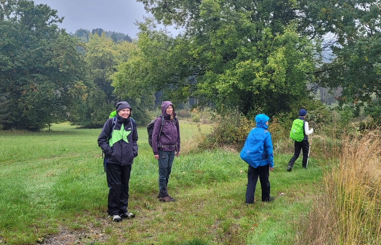 Die waren auch nötig, denn die Wetterprognosen für den zweiten Tag verhießen viel Feuchtigkeit von oben. Oft hat man bei Wanderungen ja Glück und die Regenhose kann im Rucksack bleiben. Nicht so an diesem Tag: Letztendlich waren nach etwa 16 km alle Regenklamotten, Schirme, Hüllen im Einsatz, die Schuhe durchnässt, aber die Stimmung in der Gruppe immer noch bestens. Vielleicht, weil die berühmten Spessarträuber keine Lust auf Raubzüge hatten und uns unbehelligt ließen oder der Spessartwald gerade im Regen eine mystische, zauberhafte Ausstrahlung hatte. Lediglich den starken Windböen musste unsere Wanderroute Tribut zollen. Statt über windige Höhen zu wandern, blieben wir ab Marjoß sicherheitshalber Richtung Mernes lieber im Tal. Und auch an diesem Abend hatten wir beim Abendessen im „Zum Jossatal“ guten Appetit und viel Spaß - und trockene Socken an den Füßen.