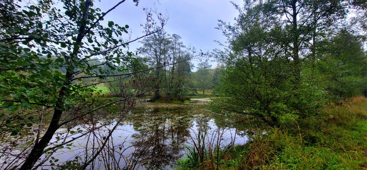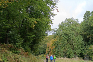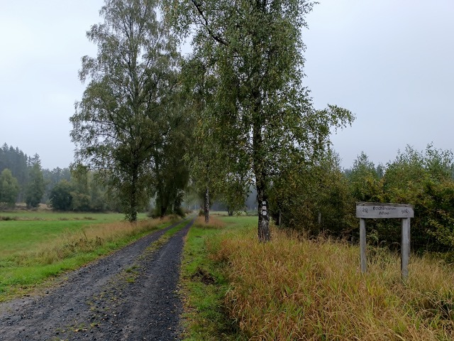 Da es sich um einen bestens markierten Premiumwanderweg handelt, aber Übernachtungsmöglichkeiten in vielen Wanderdestinationen leider immer rarer werden, muss man heutzutage einfach kreativ sein und sich zu helfen wissen: Zum Beispiel, indem man auch mal in umgekehrter Richtung läuft, ein festes Quartier für die Übernachtungen wählt oder An- und Abfahrten zu den Wander-Start- und -Zielorten mit einem Taxi organisiert. All das wurde von Lenore Hinkel, der Wanderleiterin, bestens vorbereitet, so dass wir (drei NaturFreunde und sechs NaturFreundinnen) uns an einem sonnigen 3. Oktober am Schlüchterner Bahnhof in Richtung Bad Soden-Salmünster bester Stimmung in Bewegung setzen konnten. Nach rund 15 km und etwa 440 hm durch wunderbaren frühherbstlichen Spessartwald waren wir pünktlich am Willingsweiher, einem lauschigen Teich, der zugleich Treffpunkt werden sollte mit den beiden bestellten Taxen. Und tatsächlich waren sie da: überpünktlich, obwohl das Navi im Wald nicht ordentlich funktionieren wollte. Noch einmal von dieser Stelle: Respekt für und Dank an die Fahrer, die uns am darauffolgenden Morgen quer durch den Wald auch wieder zurück an den Willingsweiher brachten. Dazwischen gab es aber leckeres Abendessen, den einen und anderen „Pilgerstoff“ im Steinkrug (oder was das Herz sonst begehrte) im gemütlichen Landgasthof „Zum Jossatal“ in Mernes – und natürlich ein bequemes Bett für die Nachtruhe und angenehme Träume.